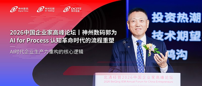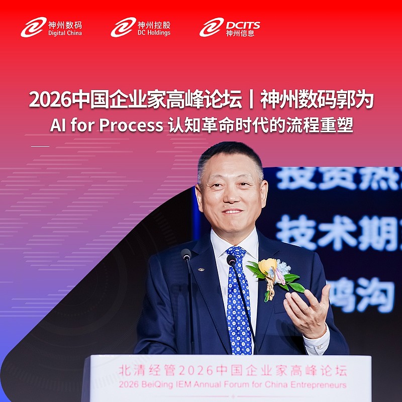2026年1月17日至18日,由北清经管高等研究院主办的2026中国企业家高峰论坛在北京国测会议中心隆重举行。本届论坛以“无界·共生”为主题,汇聚众多中国企业家与学界、产业界代表,围绕新技术浪潮下的商业变革展开深入交流,共同探寻2026年的企业发展新路径。神州信息董事长郭为受邀出席本次论坛,并发表了题为 《AI for Process:认知革命时代的流程重塑》 的主旨演讲,系统阐述了AI时代企业生产力重构的核心逻辑。