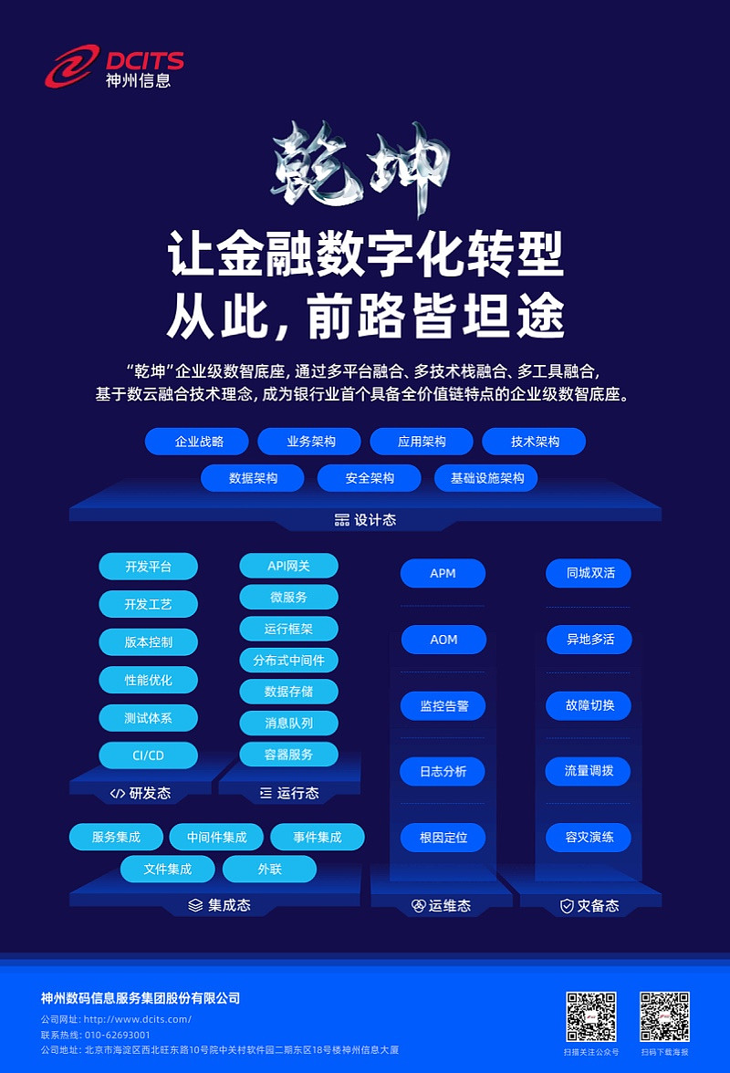 “乾坤”企业级数智底座,聚焦推动行业数智化转型,融合了神州信息多年的数字化服务经验与前沿技术。平台围绕“数云融合”理念,通过多平台融合、多技术栈融合、多工具融合,成为中国银行业首个具备全价值链特点的平台级数智底座。