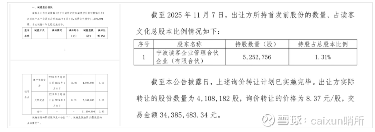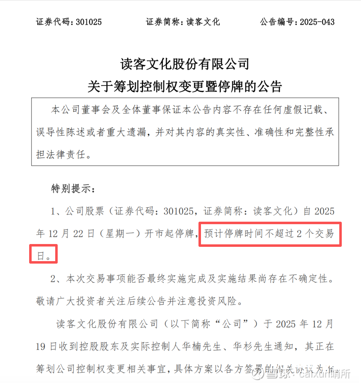 公开信息显示,读客文化主营业务为图书策划与发行,华楠、华杉合计控制公司71.91%股份,二人同时为知名营销咨询公司华与华的核心创始人。公告披露,控制权变更具体方案尚在筹划中,尚未签署正式协议,存在不确定性。值得注意的是,停牌前读客文化股价已出现异动,12月19日公司股价放量上涨超5%。此外,华楠、华杉的一致行动人年内已多次减持公司股份,累计套现超1亿元。