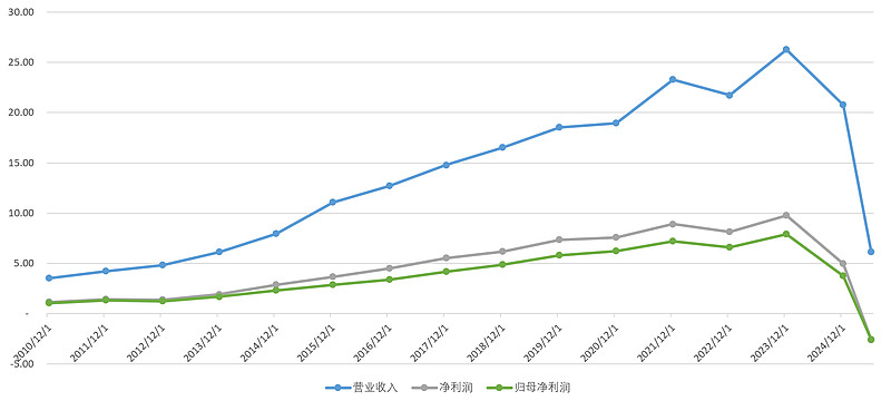 2010年以来,营收、净利润、归母净利润呈现的趋势一致,主要的波动是: