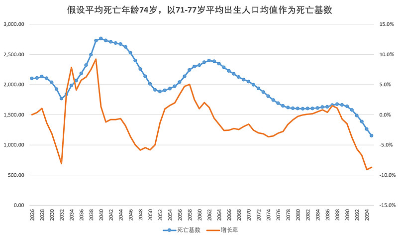 2032-2040年的死亡基数上升,从1768万人上升到2763万人,增幅56.33%,是一个爆发式增长。