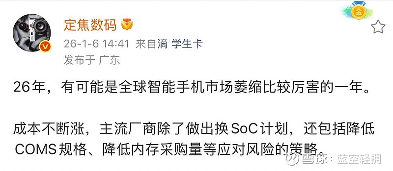$水晶光电(SZ002273)$ $苹果(AAPL)$ $蓝特光学(SH688127)$ 2026对消费电子零部件厂商不是好年份。AI服务器带动的存储颗粒和芯片价格暴涨,将大幅侵蚀手机等消费电子产品的利润,仅内存一项推高硬件成本超20%。对绝大部分厂商来说,只能取消高价值量如影像系统升级,不排除降低入门级产品规格,同时对产业链大幅压价。
