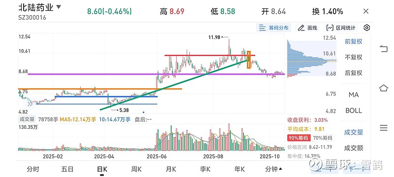 #雪鹤视点# #在投资路上# #看图识T# 对于$北陆药业(SZ300016)$ 股东频频减持,我想说,我也做了减持,不知道二级市场股价能否击穿平台(图中紫线位置)?拭目以待。点评:试问一下,你是随波逐流,还是激流勇进!