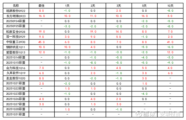 说明: 黑三角代表发布日,拒绝马后炮,相关发帖可按日期回溯,如果没有则为彩蛋内容; 选股模型纯自研不外传,选股结果每日无偿发布,抛砖引玉,仅供备选池参考.