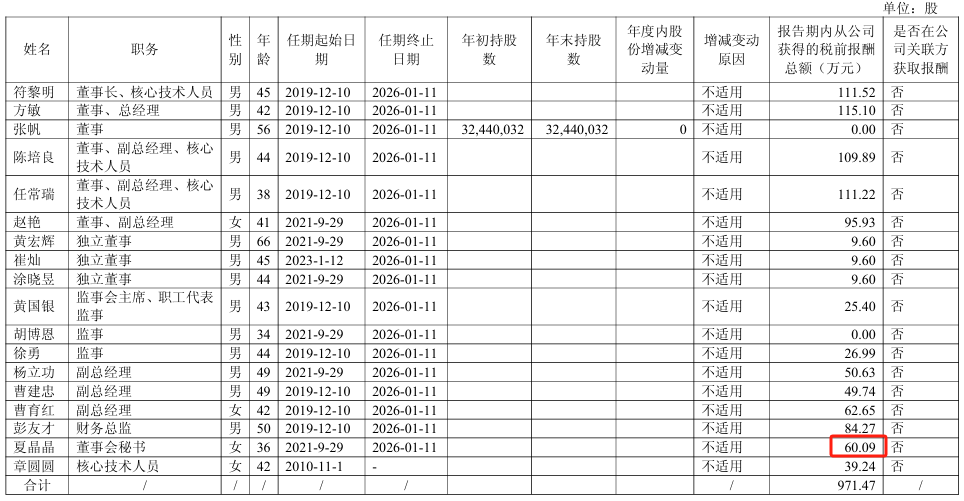 董事会秘书夏晶晶2024年薪酬为60.09万元,2023年薪酬为58.41万元,涨薪1.68万元。
