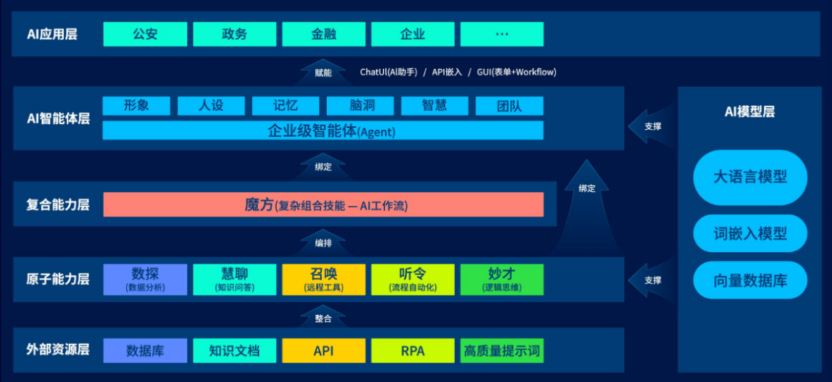 慧巢的核心在于其六大核心模块:慧聊、妙才、数探、听令、召唤和魔方。这些模块覆盖了从基于企业知识库的智能问答、分钟级业务AI能力开发、自然语言交互的数据分析,到RPA任务执行、企业API资源调用,以及复杂AI工作流的可视化编排等多元化需求。这六大模块共同作用,旨在打破传统AI应用中的种种限制,为用户提供更加精准、高效的AI服务。