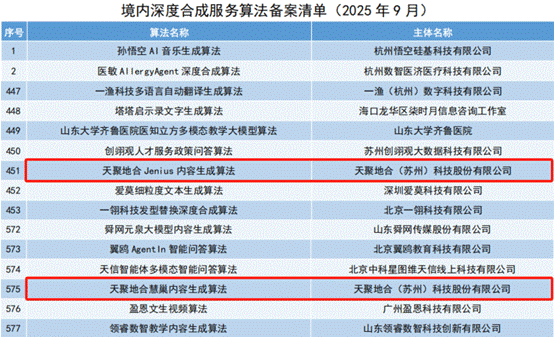 在强化技术能力的同时,Jenius在合规建设方面也取得重要突破。Jenius在核心算法能力与合规建设方面也取得重要进展。9月11日,国家互联网信息办公室发布第十三批深度合成服务算法备案信息公告,Jenius内容生成算法与慧巢内容生成算法正式通过备案。此次双算法成功备案,标志着天聚地合在内容生成领域的技术实力与合规管理水平获得国家级认可。其中,Jenius内容生成算法基于先进的自然语言处理技术,可根据用户需求生成多种类型的文本内容;慧巢内容生成算法则能够深入理解并解析复杂的信息需求,输出结构清晰、逻辑严密的高质量内容。