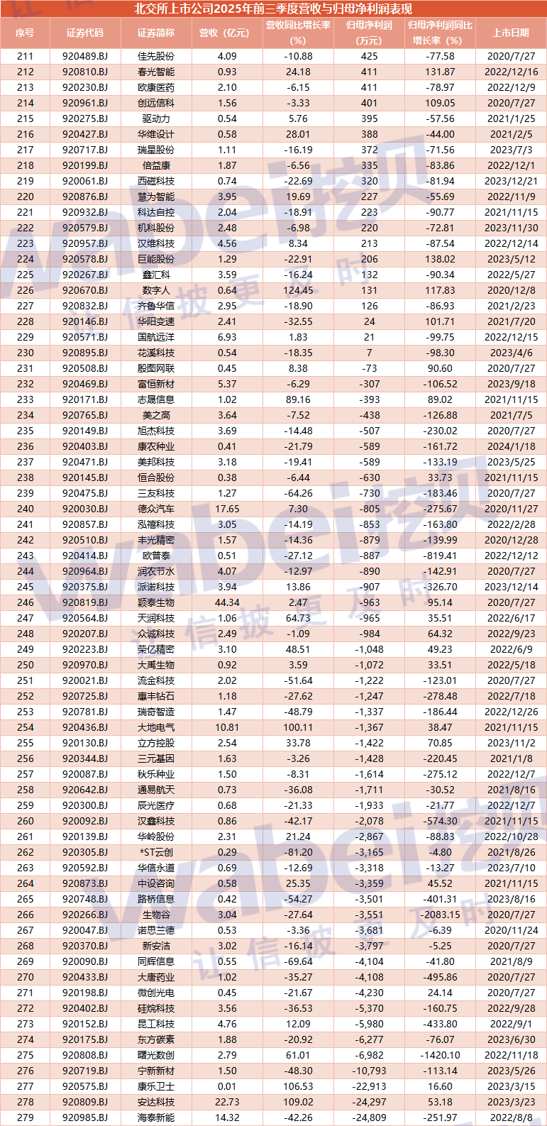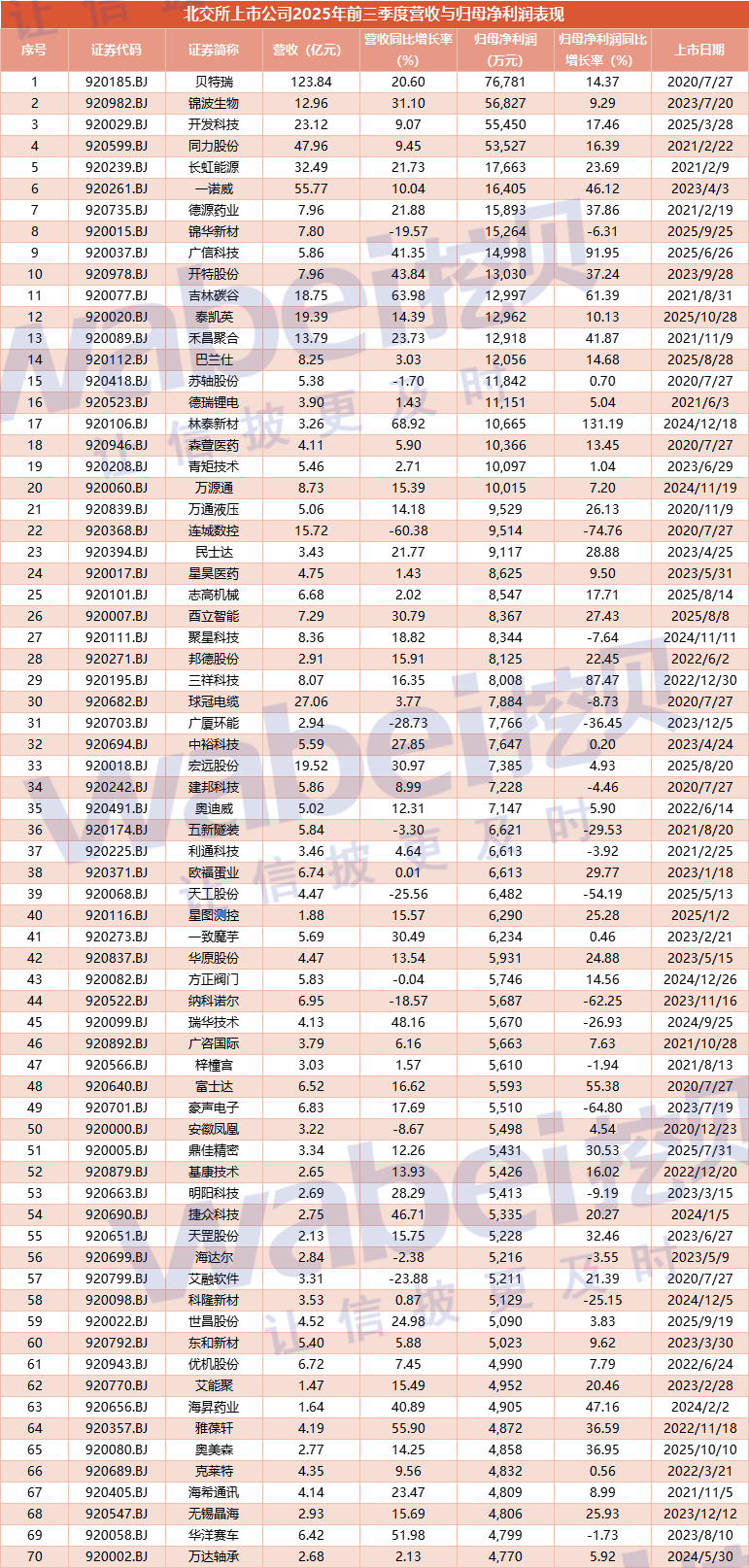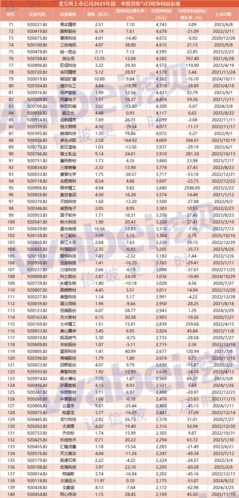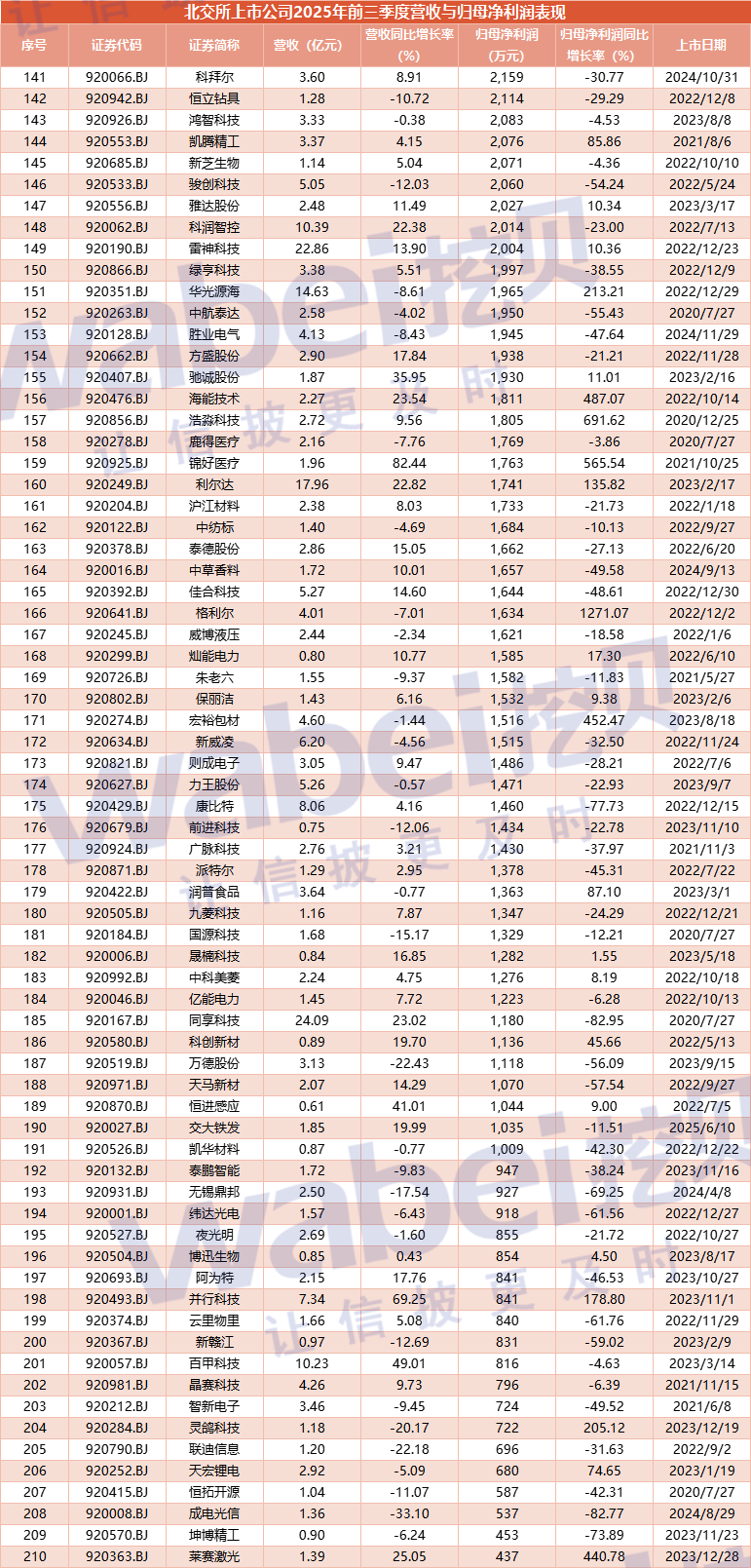附-北交所上市公司2025年前三季度营收与归母净利润表现