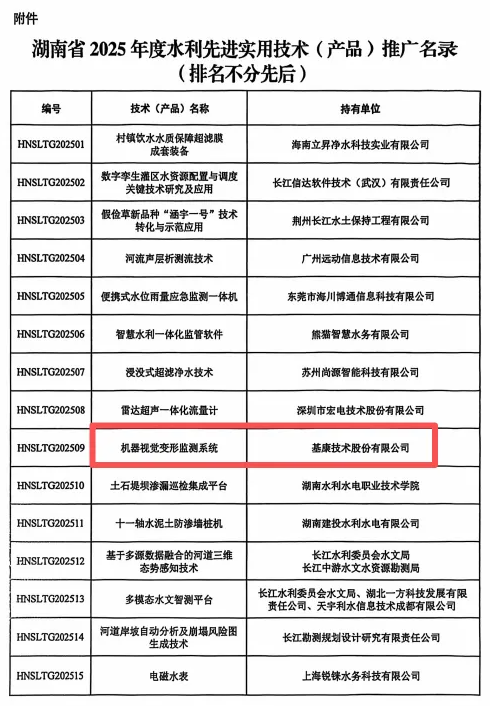 2025年11月3日,由湖南省水利厅主办,湖南省水利水电科学研究院、湖南省水利学会承办的第五届湖南省水利先进实用技术(产品)推介会在长沙隆重开幕。在前期技术征选活动中,基康技术股份有限公司(以下简称“基康技术”)的机器视觉变形监测系统凭借其技术优势成功入选推广名录。这一荣誉是对基康技术持续专注技术创新与产品研发的高度认可,充分彰显了行业对公司产品价值的高度肯定。