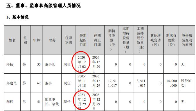 与此同时,董事会同意聘任实控人邱建民的儿子邱扬出任总裁,本次聘任后,邱扬任职公司董事长兼总裁。