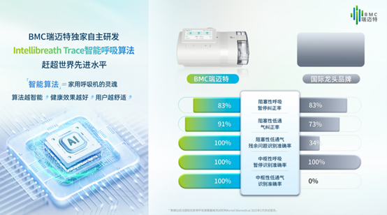 家用呼吸机的自动调压对事件识别和响应能力取决于其算法是否足够优秀。BMC瑞迈特独家Intellibreath Trace智能呼吸算法以优秀的呼吸事件识别准确率、应对准确率显著优于其它品牌产品,标志着中国呼吸机智能算法已经走上世界顶尖行列。