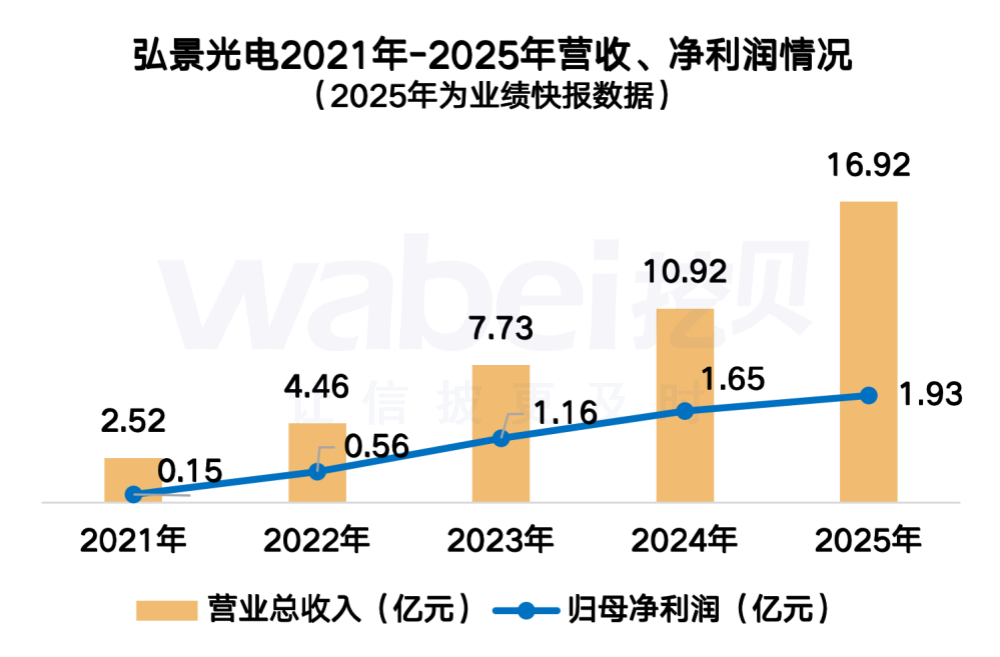 挖贝网 3月4日消息,弘景光电(301479)披露2025年度业绩快报,报告期内,公司实现营业收入16.92亿元,同比增长54.95%;归母净利润1.93亿元,同比增长16.72%。