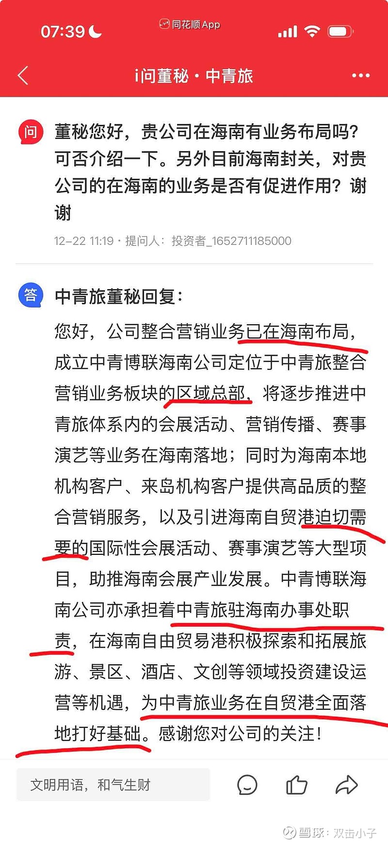 证券日报网讯 12月26日,中青旅在互动平台回答投资者提问时表示,公司整合营销业务已在海南布局,成立中青博联海南公司定位于中青旅整合营销业务板块的区域总部,将逐步推进中青旅体系内的会展活动、营销传播、赛事演艺等业务在海南落地;同时为海南本地机构客户、来岛机构客户提供高品质的整合营销服务,以及引进海南自贸港迫切需要的国际性会展活动、赛事演艺等大型项目,助推海南会展产业发展。中青博联海南公司亦承担着中青旅驻海南办事处职责,在海南自由贸易港积极探索和拓展旅游、景区、酒店、文创等领域投资建设运营等机遇,为中青旅业务在自贸港全面落地打好基础。