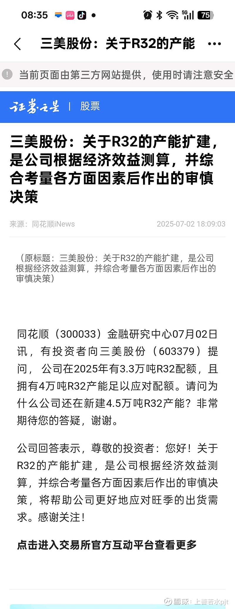 $三美股份(SH603379)$ 确实蹊跷,公司在2025年有3.3万吨R32配额,且拥有4万吨R32产能足以应对配额。为什么公司还在新建4.5万吨R32产能?公司回答表示,尊敬的投资者:您好!关于R32的产能扩建,是公司根据经济效益测算,并综合考量各方面因素后作出的审慎决策,将帮助公司更好地应对旺季的出货需求。公司这个答复也是莫名其妙,配额管死了,经济效益再好,也不能多生产,何况已经有4万吨空余产能。再建4.5万吨岂不是浪费?是钱多没地花?还是预见到未来R32配额有很大扩容?
