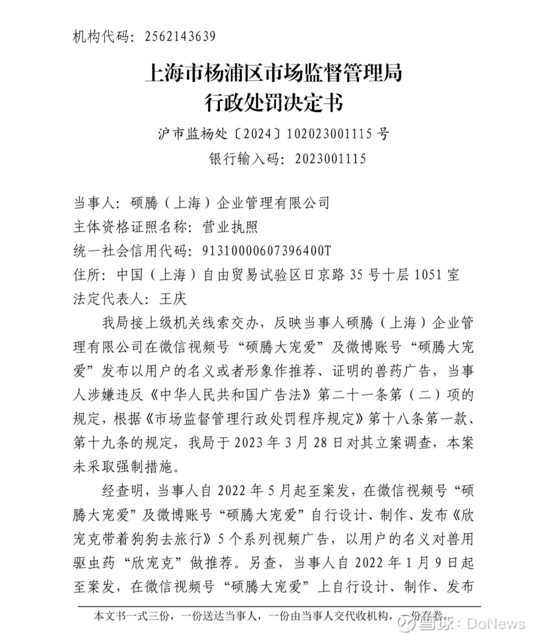 DoNews9月20日消息,近日,上海市市场监督管理局发布了2024年第二批虚假违法广告典型案例通报,其中,知名动物保健企业硕腾中国总部硕腾(上海)企业管理有限公司因发布违规广告而遭受严厉处罚。