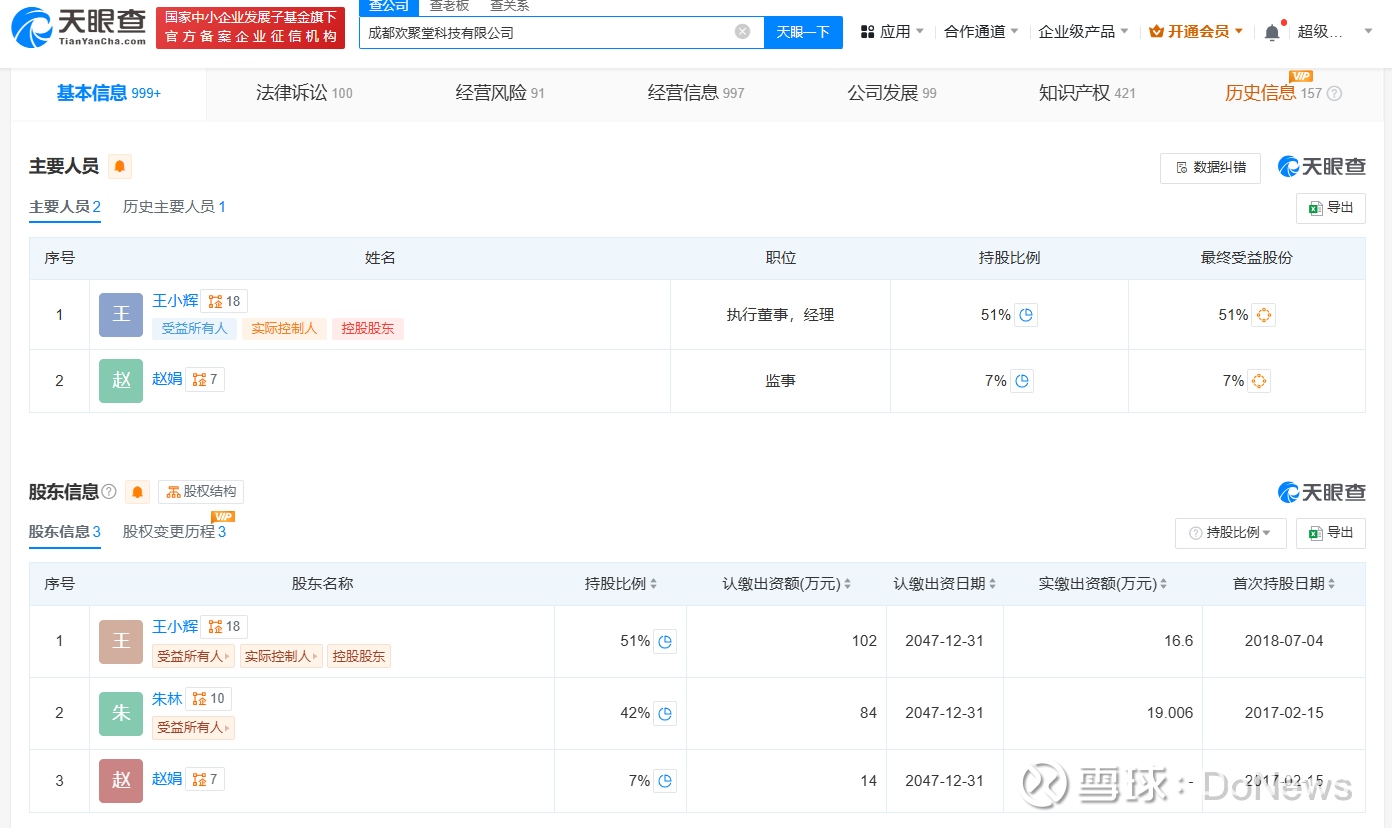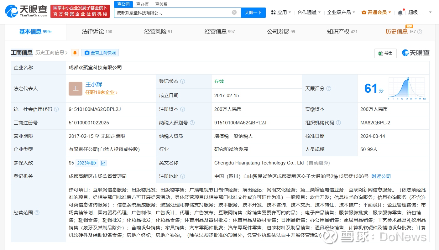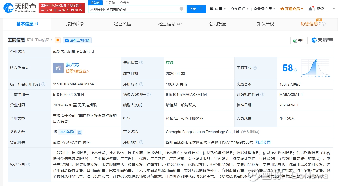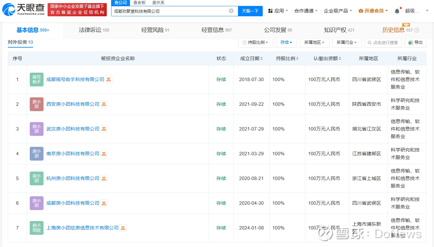 天眼查App显示,“成都房小团”关联公司成都欢聚堂科技有限公司成立于2017年2月,法定代表人为王小辉,注册资本200万人民币,经营范围包括互联网信息服务、广播电视节目制作经营、互联网新闻信息服务、房地产经纪、房地产咨询等,由王小辉、朱林、赵娟共同持股。对外投资信息显示,该公司全资持股7家存续公司,包括成都房小团科技有限公司、成都摇号助手科技有限公司、杭州房小团科技有限公司等,分布在西安、武汉、南京、上海等地。其中,成都房小团科技有限公司成立于2020年4月,法定代表人为魏兴龙,注册资本100万人民币,经营范围包括信息系统集成服务、企业管理咨询、广告制作、广告发布等,由成都欢聚堂科技有限公司全资持股。