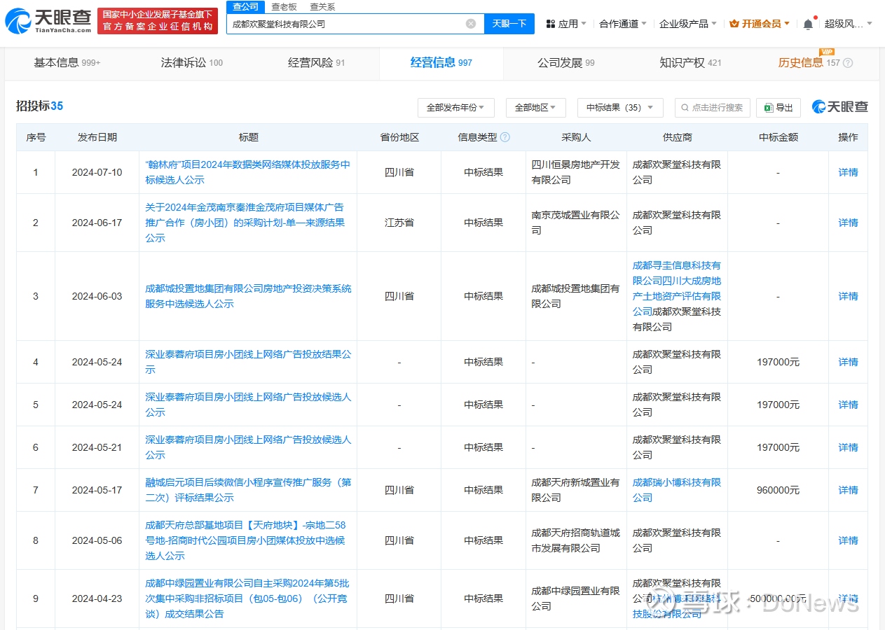 招投标信息显示,成都欢聚堂科技有限公司曾中标“翰林府”项目2024年数据类网络媒体投放服务、深业泰蓉府项目房小团线上网络广告投放、成都天府总部基地项目【天府地块】-宗地二58号地-招商时代公园项目房小团媒体投放等多个项目。