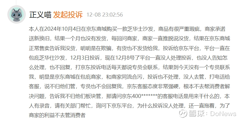 DoNews12月9日消息,近日,在黑猫平台,有消费者投诉自己6979元购买的CHEERS芝华士沙发有质量问题,商家承诺送新换旧,结果拖延一个月也没发货,问就说没货。