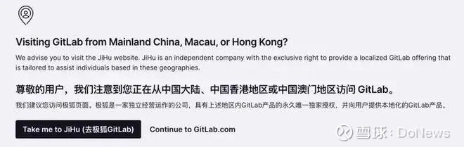 DoNews12月30日消息,GitLab 是全球第二大开源代码托管平台。近日 GitLab 宣布,将停止为中国大陆、澳门和香港的用户提供 GitLab. com 账号服务。如果访问 GitLab 官网,将会出现如下的界面,推荐现有用户迁移至极狐 GitLab. cn。