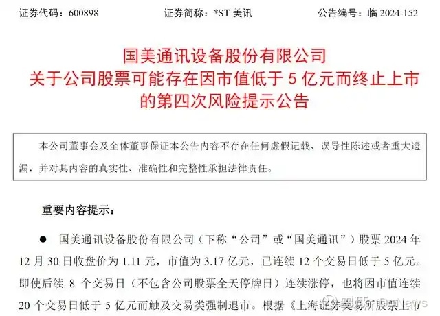 按照退市新规,自今年10月30日起,沪深主板上市公司若连续20个交易日收盘总市值均低于5亿元,将被终止上市,属交易类强制退市,这意味着国美通讯将面临着强制退市的风险。