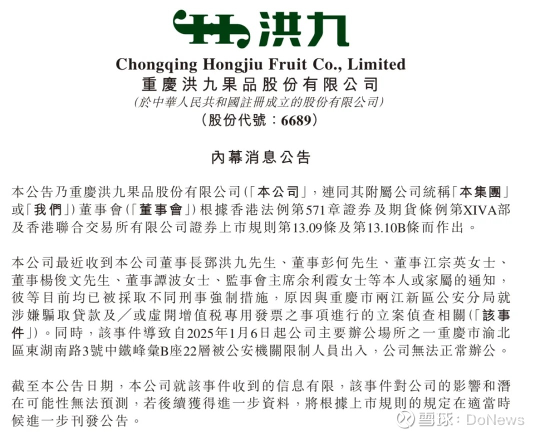 DoNews4月17日消息,重庆洪九果品股份有限公司(以下简称“洪九果品,06689.HK)17日凌晨发布公告称,公司董事长邓洪九,董事彭何、江宗英、杨俊文、谭波及监事会主席余利霞等,目前均已被采取不同刑事强制措施,原因与重庆市两江新区公安分局就涉嫌骗取贷款及/或虚开增值税专用发票之事项进行的立案侦查相关。
