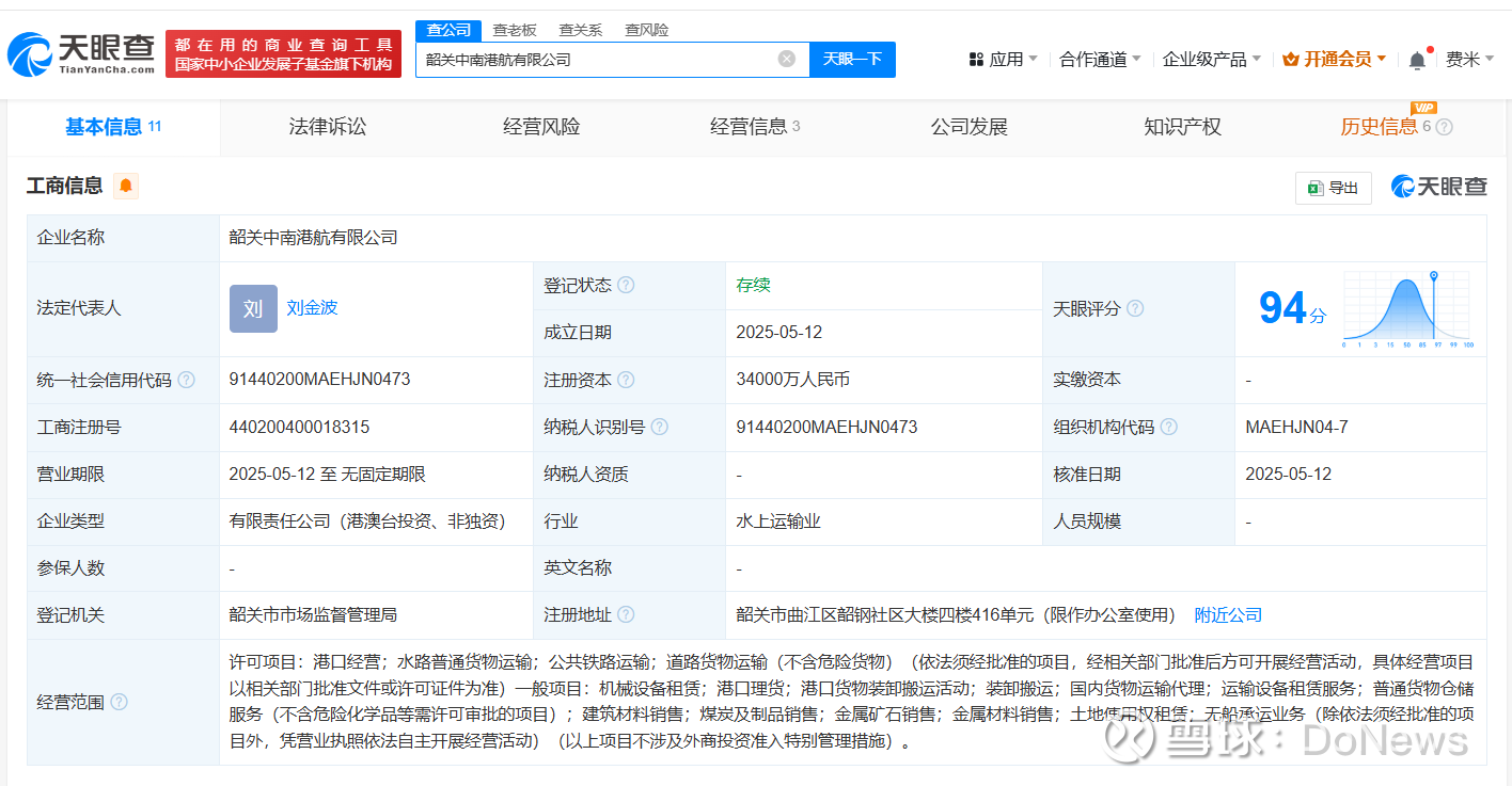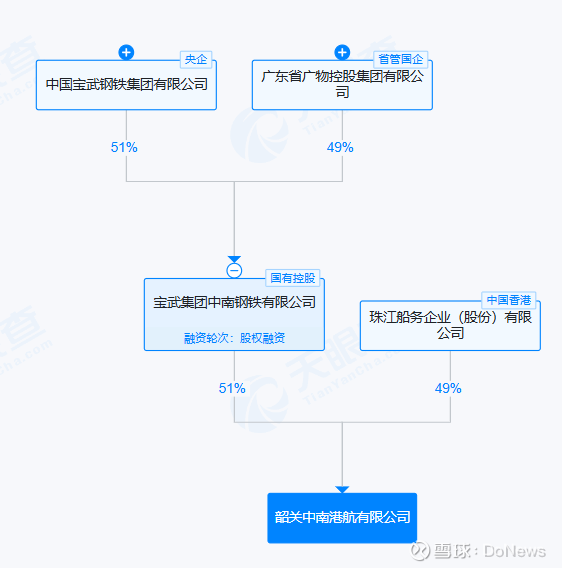 天眼查App显示,近日,韶关中南港航有限公司成立,法定代表人为刘金波,注册资本3.4亿人民币,经营范围包括港口经营、水路普通货物运输、公共铁路运输、机械设备租赁、港口理货、港口货物装卸搬运活动等。股权全景穿透图显示,该公司由中国宝武旗下宝武集团中南钢铁有限公司、珠江船务(HK.00560)共同持股。