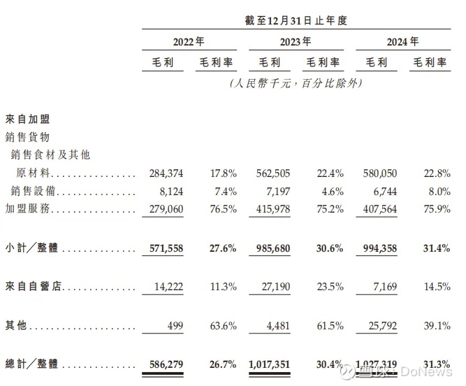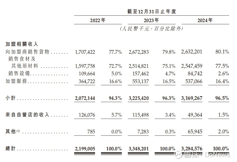 根据招股书,沪上阿姨2024年收入为32.8亿,同比下滑1.9%,净利润3.29亿元,同比下滑15.2%。沪上阿姨来自加盟商的收入占比极高,且比例还在上升。2022年至2024年,加盟相关收入分别为20.7亿元、32.3亿元和31.7亿元,占比分别为94.3%、96.3%和96.5%。