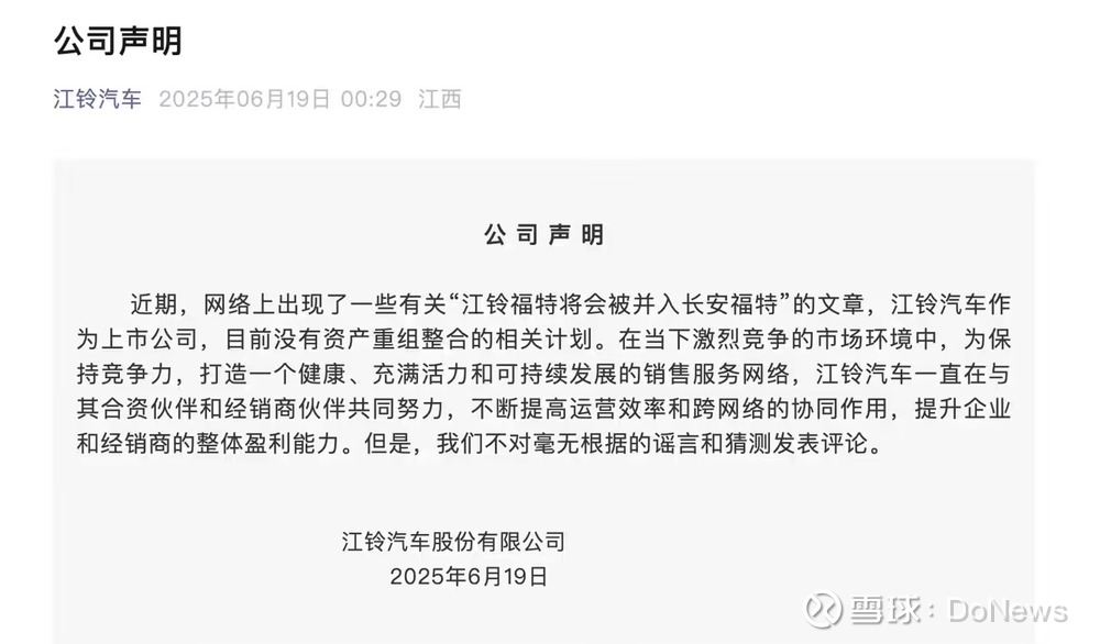 DoNews6月19日消息,江铃汽车今日凌晨通过公众号发布声明,就日前“江铃福特并入长安福特”传闻进行回应。