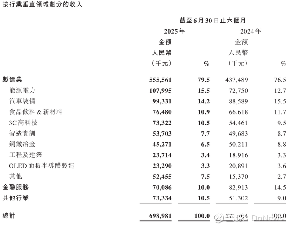 创新奇智2025年上半年来自金融服务行业的收入为7009万元,占营收的比例为10%;其他行业的收入为7333万元,占比为10.5%。