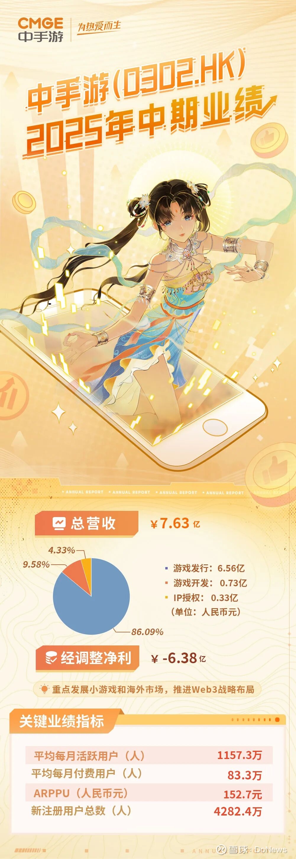 关键业绩指标方面,截至2025年6月30日,中手游新注册用户总数达4282.4万名。月平均活跃用户数约 1157.3 万名;月平均付费用户数约 83.3 万名;ARPPU 达人民币 152.7 元。平均每月活跃用户数和平均每月付费用户数因部分老游戏步入生命周期后期及新游戏用户转化尚在爬坡期而有所下滑。