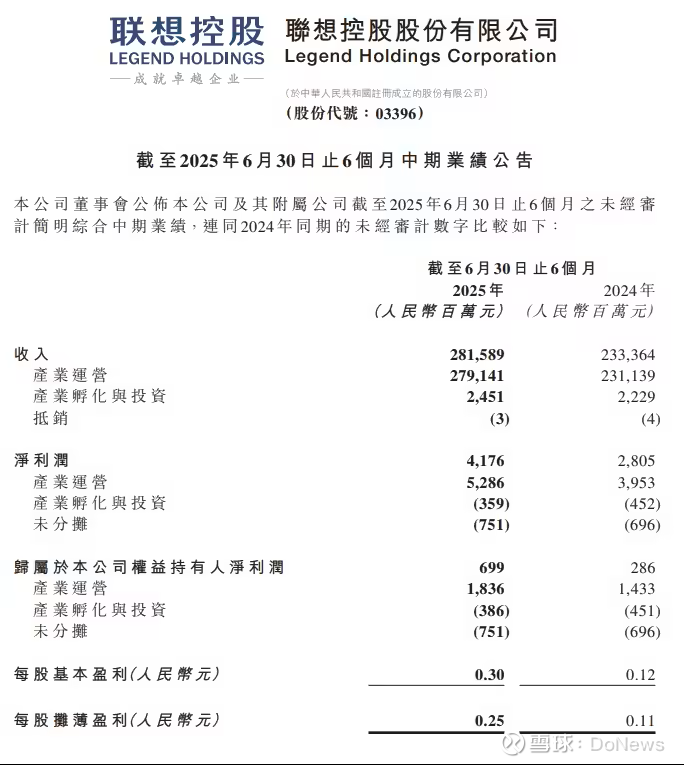 DoNews8月29日消息,联想控股刚刚公布了截至 2025 年 6 月 30 日止 6 个月中期业绩公告,汇总主要数据如下:收入 2815.59 亿元,去年同期 2333.64 亿元,同比增长 20.67%;净利润 41.76 亿元,去年同期 28.05 亿元,同比增长 48.88%;归母净利润 6.99 亿元,去年同期 2.86 亿元,同比增长 144.41%。