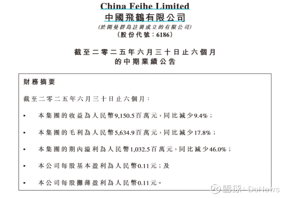DoNews9月3日消息,据趣解商业报道,近日,中国飞鹤(6186.HK)披露了2025年上半年业绩报告。报告显示,上半年,中国飞鹤实现营业收入91.5亿元,同比下降9.36%;净利润10.3亿元,同比大幅下滑46.66%。