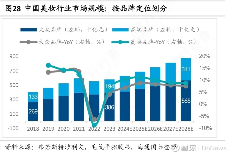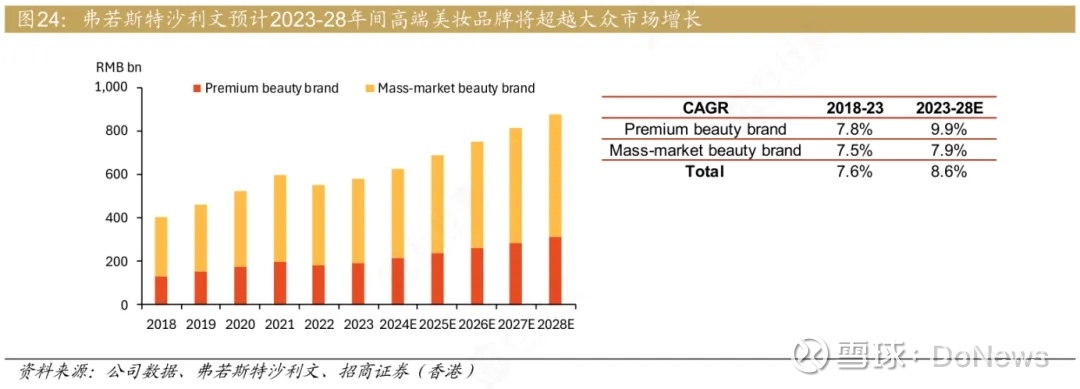 数据显示,2023至2028年间,高端美妆品牌的复合年增长率(CAGR)预计将达到9.9%,显著高于同期大众美妆品牌的7.9%。