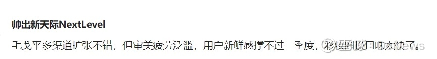 用户反馈:尽管“帅出新天际NextLevel”网友认为“毛戈平多渠道扩张不错”,但也有声音质疑:“审美疲劳泛滥,用户新鲜感撑不过一季度,彩妆圈换口味太快了。”可以说若缺乏持续创新,大单品可能迅速被竞品替代。