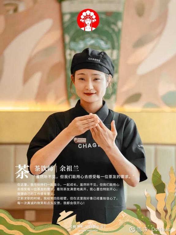 另一位无声门店店员冶倩是一位先天性聋哑人士,因无法跟他人正常交流而一度感到自卑。“我刚加入霸王茶姬时,很害怕给顾客留下不好的印象。经过同事的帮助后适应了新环境。对我来说,来无声门店工作是一次放心大胆的尝试,更是一次救赎,谢谢霸王茶姬没有抛弃我们。”