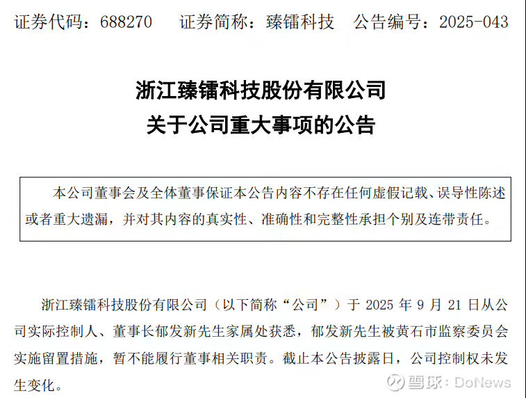 DoNews9月22日消息,臻镭科技 9 月 21 日晚间发布《关于公司重大事项的公告》称,公司实控人、董事长郁发新被黄石市监察委员会实施留置措施,暂不能履行公司董事的相关职责。公开资料显示,1975 年出生的郁发新,从 2006 年 1 月至今,还担任浙江大学航空航天学院教授。