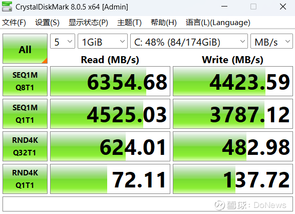 内存的读写速度分别来到读63432 MB/s、写100774 MB/s,固态的读写也来到了读取6354.68MB/s、写入4423.59MB/S,这里完全可以从容应对绝大部分大型应用和办公内容。