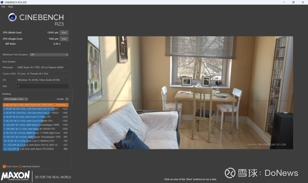 Cinebench R23主要反映CPU多核、单核跑分,反映CPU的通用计算能力,Dell Pro 13 Plus锐龙 AI版多核心12541分,单核1963分。