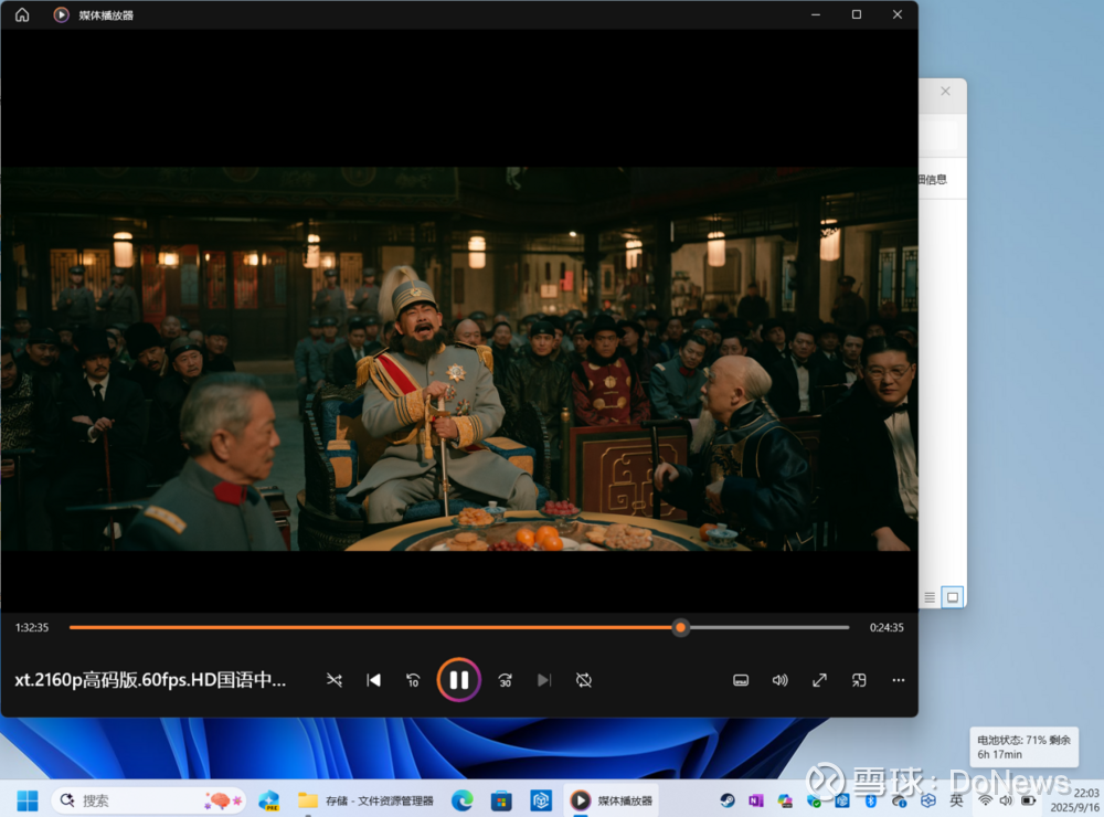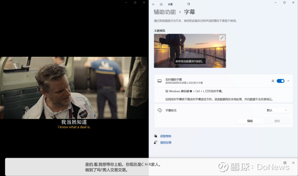 Windows 11 AI+PC的功能也是可以助力用户完成许多高效的任务,比如这个实时AI翻译的实时字幕功能。我们可以对字幕样式进行设置,可以看到这一部电影我们选择开启实时字幕,也会在窗口的下方看到翻译内容。