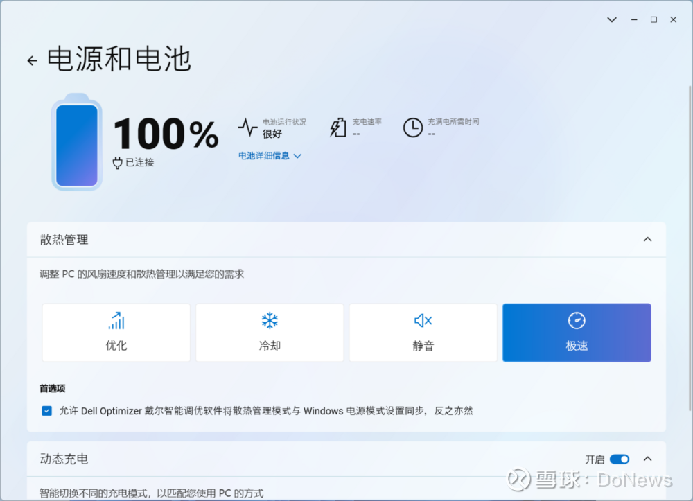 戴尔的专属电池和散热管理软件,将Windows电源模式和散热管理一同接管,支持优化、冷却、静音、极速四种风扇散热模式。还支持智能切换充电模式的动态充电功能,通过智能CPU性能动态延长续航时间。
