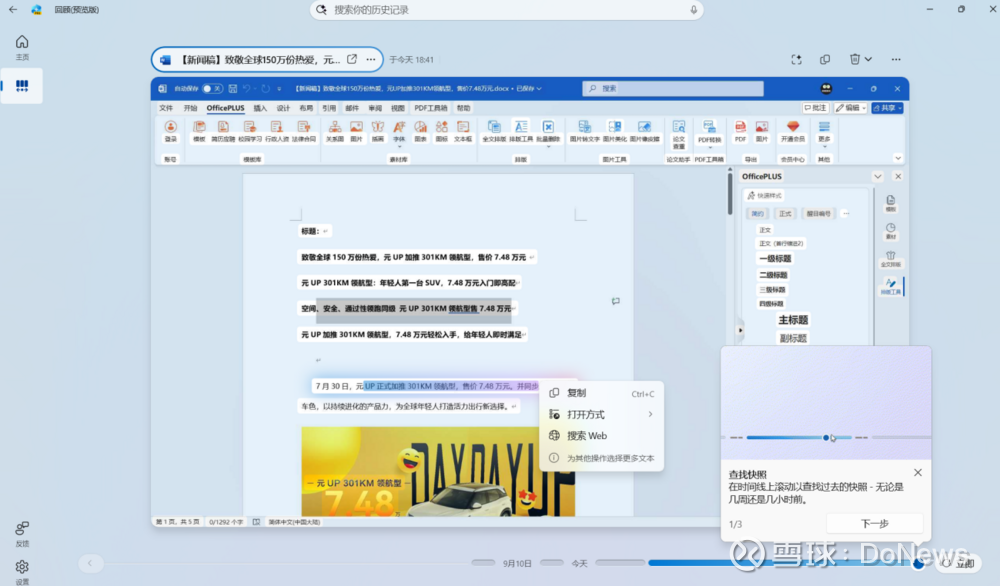 单击以执行(Click to Do)是增强版的AI一键识屏,按住Windows键+鼠标左键在系统任意界面下滑动,或触屏设备从屏幕右侧边缘向左滑动即可唤醒Click to do,它将立刻对当前屏幕显示内容进行分析和拆解,可进行内容的快速编辑,该功能也可以和Recall联动,在Recall中对时间线上的某段记录进行Click to do AI分析和拆解操作,AI可以访问整个系统的任意界面。