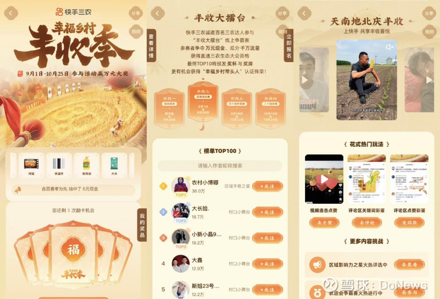 秋风绘就丰收画卷,数字赋能乡村振兴。为庆祝第八个中国农民丰收节,快手三农在9月正式推出“2025幸福乡村丰收季”系列活动,以“丰收大擂台”区域争霸赛为核心载体,叠加#助农帮帮团、#村口小舞台、#新农人丰收日记、#丰收时节乡味浓、#渔乐圈丰收季 等特色话题,通过短视频、直播多维度、沉浸式的线上内容呈现,立体展现当代农业农村的新气象。