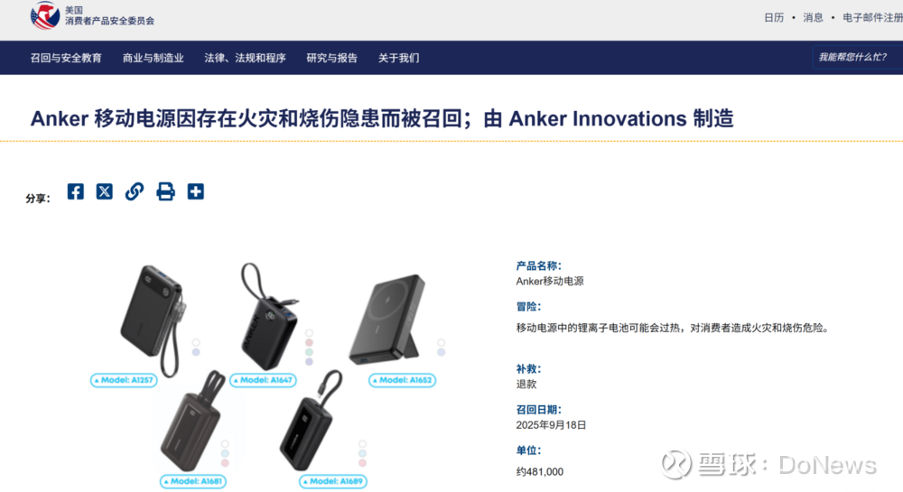 DoNews9月25日消息,据新浪科技《BUG》栏目报道,近日,美国消费者产品安全委员会(简称:美国CPSC)发布公告称,Anker移动电源因存在火灾和烧伤隐患召回约48.1万个充电宝。据悉,目前安克创新已收到33起火灾和爆炸事故报告,其中4人轻度烧伤,1人严重财产损失。