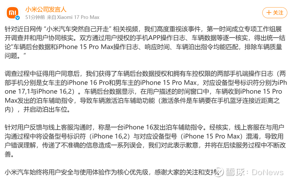 针对近日网传“小米汽车突然自己开走”相关视频,我们高度重视该事件,第一时间成立专项工作组展开调查并和用户协同核实。双方通过用户授权的手机 App 操作日志、车辆数据等逐一核实,得出统一结论“车辆后台数据和 iPhone 15 Pro Max 操作日志、响应时间、车辆泊出指令均能匹配,排除车辆质量问题。”