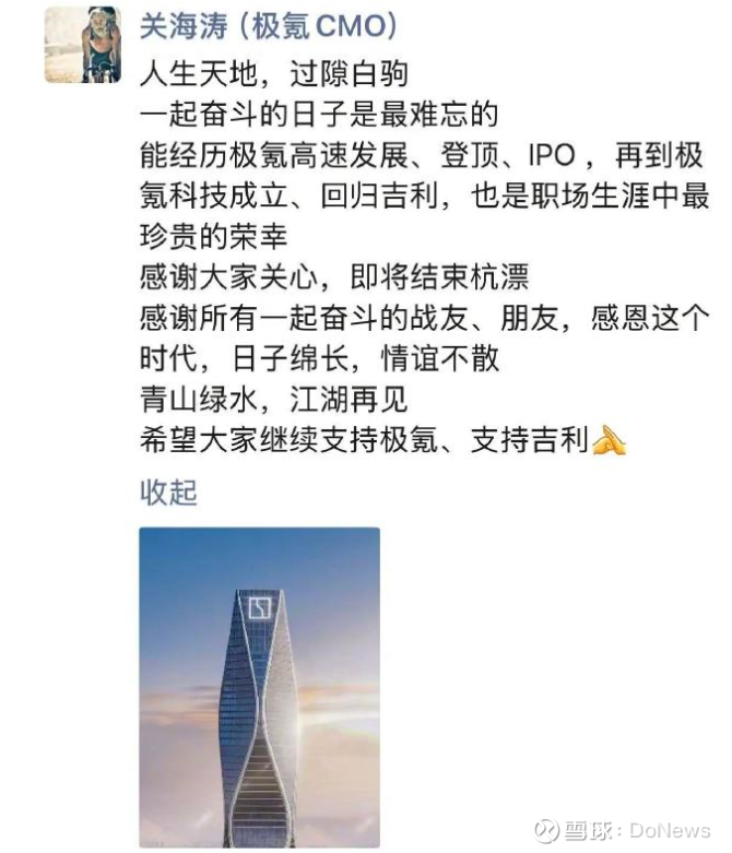DoNews10月10日消息,近日有媒体报道称,极氪科技集团CBO关海涛已于近日离职,并不再担任公司任何职务。针对外界传闻,极氪科技集团CBO关海涛今日在朋友圈发文宣布即将离职。