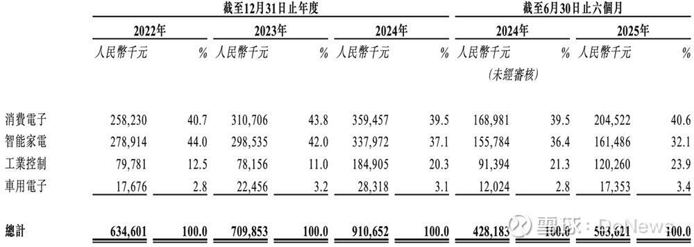 2025年上半年,消费电子、智能家电、工业控制、车用电子应用场景分别贡献了中微半导收入的40.6%、32.1%、23.9%、3.4%。