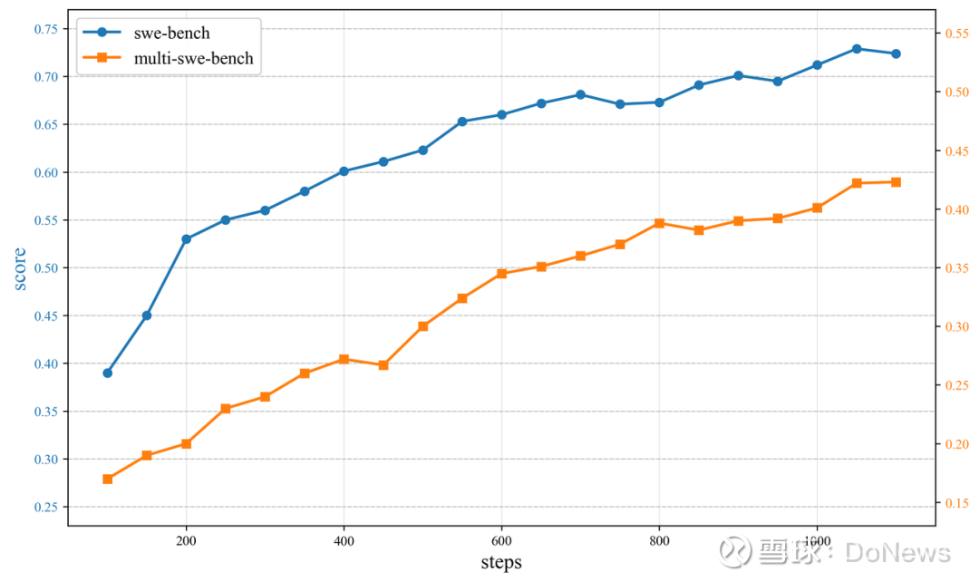 训练结果显示,模型在 Multi-SWE-Bench 和 SWE-Bench-Verified 两个数据集上的表现稳定上升,展现出良好的泛化能力。在 SWE-Bench 基准测试中,仅依赖 RL 训练的 Doubao-Seed-Code 模型就可达到最优水平,表明纯强化学习在真实编程场景下具备潜力。