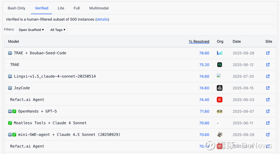 DoNews11月11日消息,今日,火山引擎正式发布豆包编程模型(Doubao-Seed-Code)。该模型专为 Agentic 编程任务深度优化,在 SWE-Bench-Verified 官方榜单中刷新 SOTA,兼容 Anthropic API 等主流开发环境。