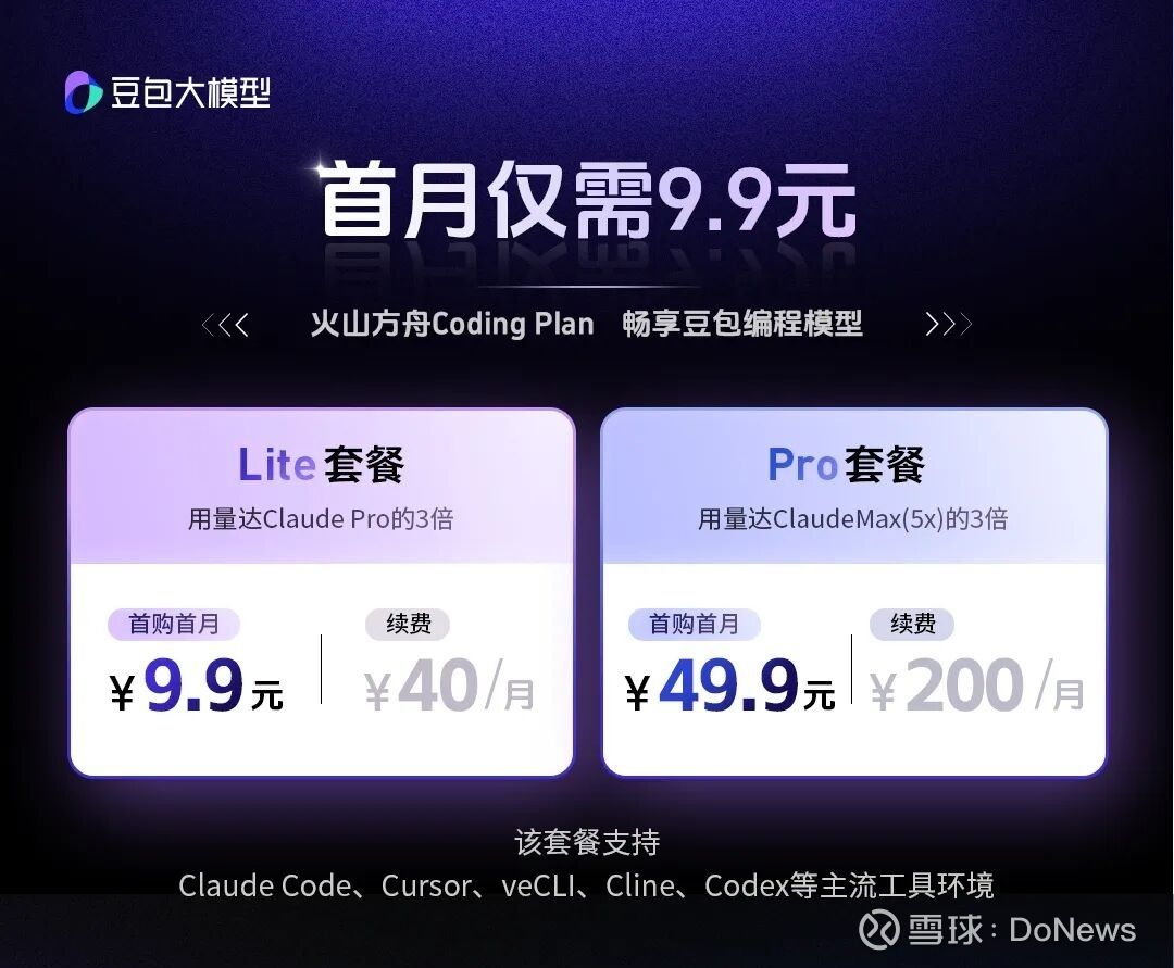 在此基础上,火山方舟还为个人开发者量身打造了“Coding Plan”优惠计划,进一步释放成本红利,最低首月 9.9 元即可畅享豆包编程模型。该套餐支持 Claude Code,以及 veCLI、Cursor、Cline、Codex CLI 等主流工具环境,更借助火山方舟超大资源池,为开发者提供稳定算力保障,获得畅快和稳定的编码体验。