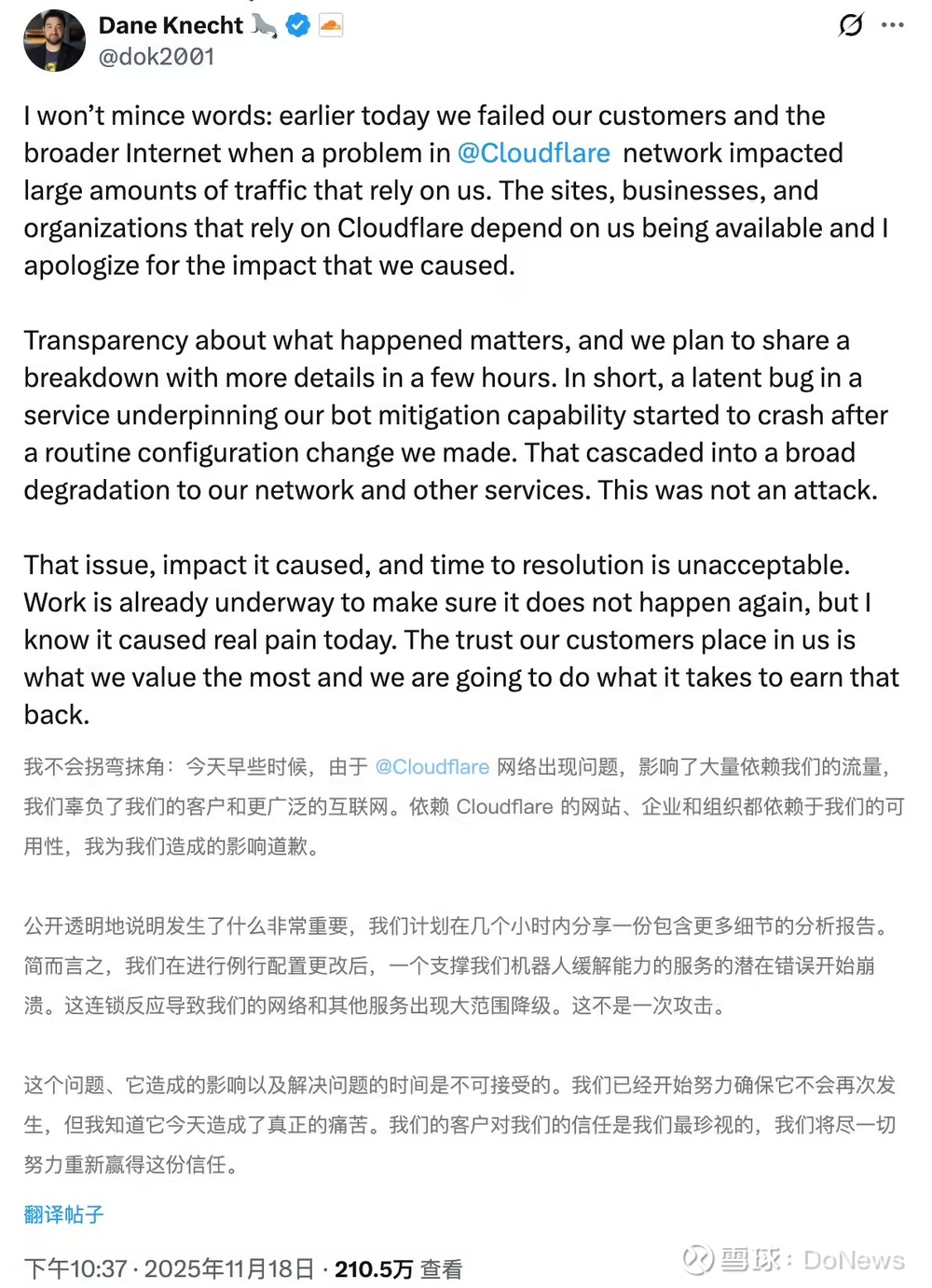 服务恢复后,Cloudflare CTO Dane Knecht 公开致歉说,此次事故“不可接受”,并指出一次例行配置调整触发了机器人防护层崩溃。